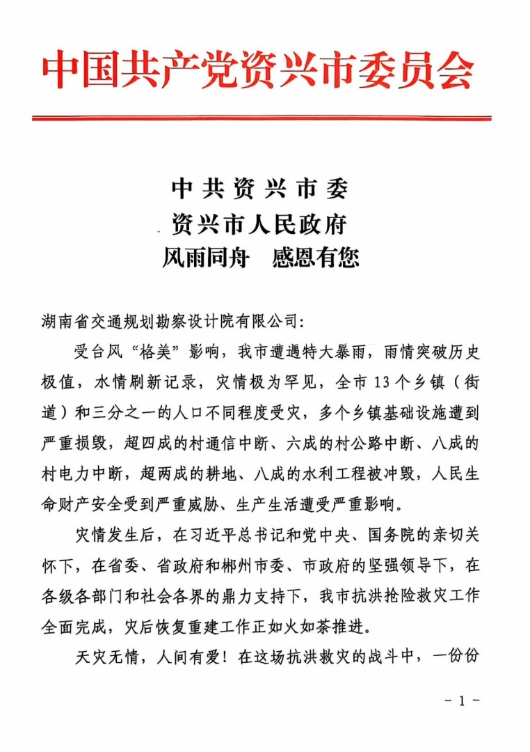 近日,中共資興市委、資興市人民政府發(fā)來感謝信,信中高度評價了湖南省交通規(guī)劃勘察設計院有限公司在馳援資興搶險救災及災后恢復重建工作中展現(xiàn)的擔當精神和技術水平,對公司作出的積極貢獻表達了誠摯的感謝。信中指出,資興市此次遭遇災情極為罕見,多地基礎設施遭到嚴重損毀、大范...